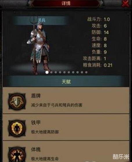 最重要的是这一个兵种拥有盾牌这一个技能,可以减少来自弓兵和弩兵的伤害,还拥有体魄技能,可以让自身的生命值大幅度的提升,铁甲这一个技能可以让民兵的防御能力大幅度的提升。