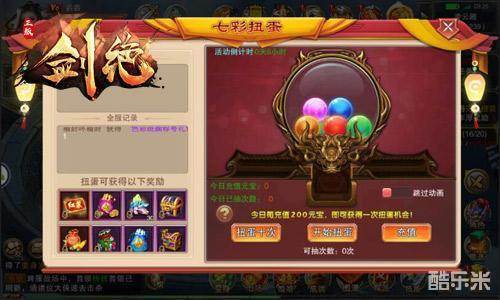 同样是蛋,可以砸的金蛋与随机抽取的扭蛋就完全不同啦!在冰河《剑绝》中,七彩扭蛋玩法同样为不定时开启的活动,但是七彩扭蛋活动奖励更丰厚!玩家参与十连扭蛋,高几率获得传说兑换券、7级宝石礼包、色彩斑斓称号礼包等道具奖励。玩家当天充值每满200元宝,更可获得1次免费单抽扭蛋机会哦!