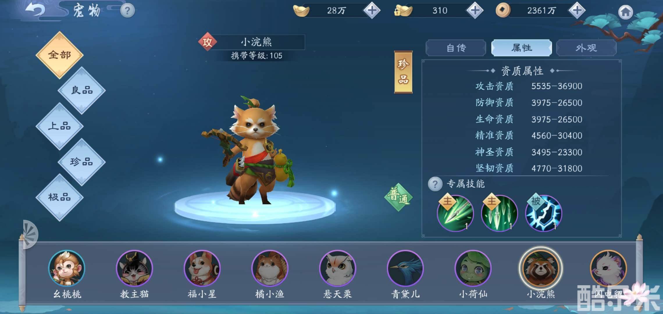 PVE推荐:在刷图中比较推荐使用小浣熊,因为可以减少防御力,而且攻击资质相当高和武当完美契合。