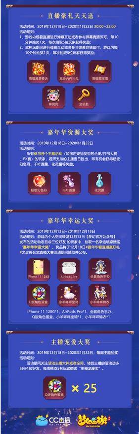 梦幻西游嘉年华作为网易游戏年度重点落地项目之一,针对本次嘉年华,CC直播同步上线了史上最强力的用户回馈活动,12月18日~12月24日,CC直播APP用户只需要观看《梦幻西游》手游直播及嘉年华珍兽合宠大赛,每5分钟便会抽一名用户赠送648元现金红包。除了现金红包大奖,CC还为用户准备了直播豪礼、嘉年华资源大奖、嘉年华幸运大奖、主播宠爱大奖等多样超值福利等待用户领取。