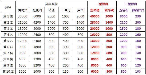 2. 活动期间累计充值金币达到10000金币,可以额外领取一重惊喜奖励(蓝命魂,紫命魂);