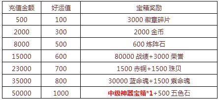 3. 活动期间累计充值金币达到20000金币,可以额外领取二重惊喜奖励(五色石,神器碎片);