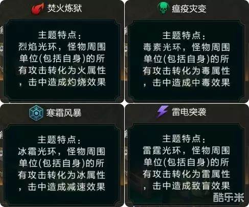 雷与冰主题会给英雄带来debuff。其中冰主题的怪物带有减速效果,鉴于大部分英雄都有位移技能,而且可以通过击杀精英怪去除减速效果,实际影响不会很大。但雷主题会降低英雄的命中率,而且出现“未命中”的概率非常高,直接降低输出效率与延长了通关时间。尤其当英雄拉了一大群怪时,不但不能快速清完,还容易被怪反杀,需要小心一点。