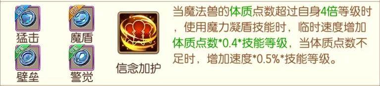 ●理由:自带魔法盾的一技能可以把它忽视了。我们直接来打造一个纯肉型魔法兽。这里不推荐打隐身,因为隐身情况下无法使用二技能进行输出,只能进行普通攻击。我个人推荐二三阶段增加高级警觉和高级重甲或者高级幸运,因为防御型魔法兽的重用也就在于拉人解封等,如魔导士需要低速拉人可打重甲加警觉。警觉的目的在于魔法兽不被封印,而重甲能做到减少速度增加防御。