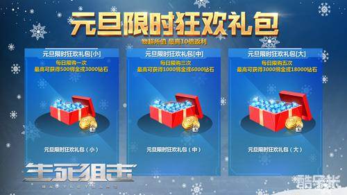 双旦期间,《生死狙击》手游中将会陆续推出“圣诞福袋”活动和“元旦狂欢限时礼包”。圣诞福袋和元旦狂欢限时礼包都分为三个档次。玩家只需花费少量金币即可开启巨额奖励!
