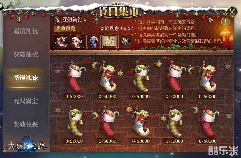 圣诞节来临,圣诞老人早已将准备好的礼物放进了圣诞礼袜当中。活动期间,船长每消耗一个圣诞铃铛即可进行一次竞猜,界面中每只礼袜均有一个正确的价格,船长们猜中即可获得藏在其中的丰厚奖励,还请多留意竞猜区间的变化以及竞猜时获得的提示哦。