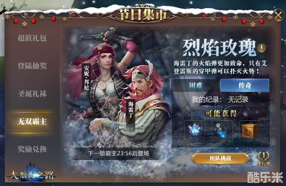 圣诞节活动期间,每日将为船长开放一组无双霸主挑战。作为一类全新来袭的PVE副本玩法,所有等级达到38级的玩家,完成五人组队之后,均可体验全新“无双霸主”玩法。