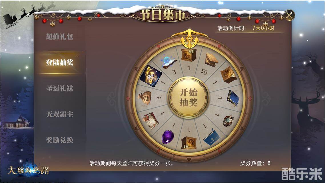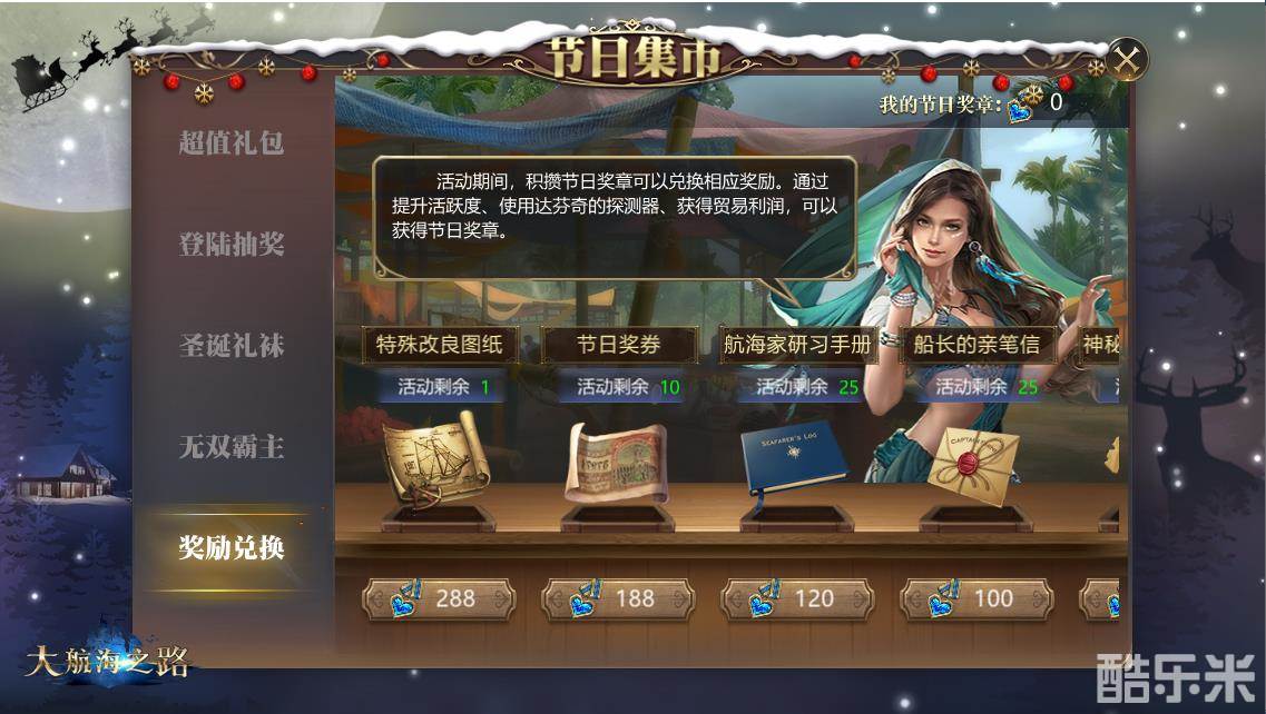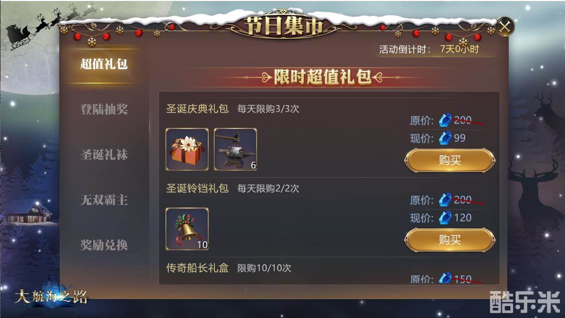 船长可以用专属的折扣价格,购买圣诞节活动专属限时减免券礼包、登陆抽奖券,获得超值游戏道具!