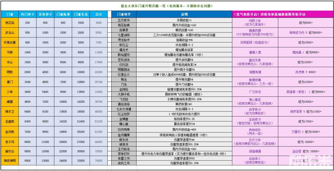 以上就是暴走大侠12月门派贡献双修奖励汇总的全部内容,大家根据自己的需要,可以在上图寻找数据,当然这张图也不是特别的准确,可能也有些小小的出入,如果跟自己的发生了冲突,还是以自己为准比较好。