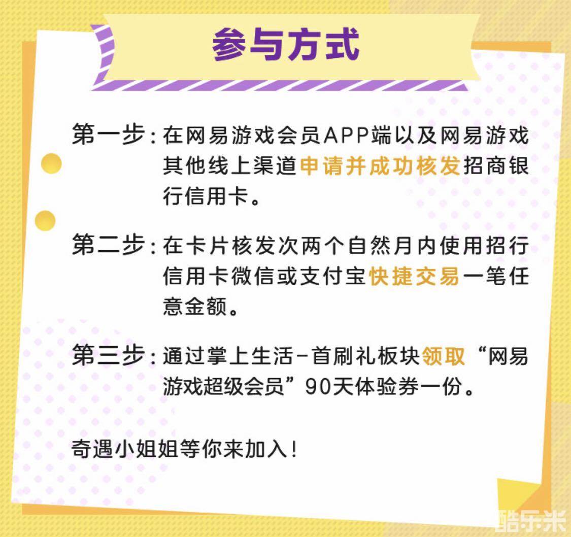 最重要的是,即日起,凡通过网易游戏会员App端以及网易游戏其他线上渠道成功办理招商银行信用卡的新户主卡持卡人,在卡片核发次两个自然月内,使用招行信用卡微信或支付宝快捷交易一笔任意金额,即可通过掌上生活-首刷礼板块领取“网易游戏超级会员”90天体验券一份。即刻登录网易游戏会员App申领联名信用卡,满满会员福利,羊毛越薅越开森!