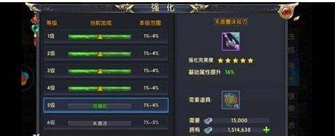 游戏中提升战力的途径有很多,现在说说一些快速且有效的方法。不得不说装备强化是提升角色战斗力最简单粗暴的方法,目前游戏中每件装备的强化等级已经提高到了十五级,如果全部强化满的话,玩家的属性将会是质的飞跃。另外每级强化还有个强化完美度,这个数值影响到当前强化等级的属性加成,系统会根据强化完美度赋予装备不同的星级,建议小资玩家可以在此多花些银币把强化完美度搞满。