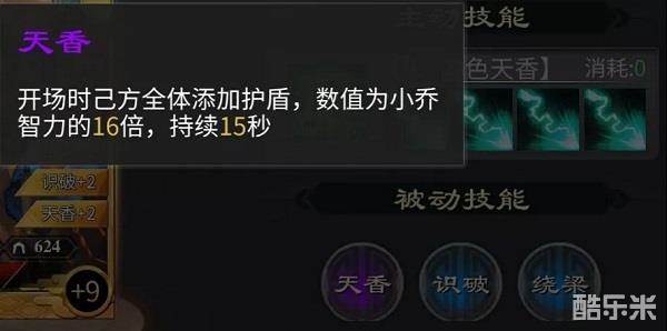 天香作为小乔独有的紫色被动,它的效果也是非常不错。3级被动2000策功的小乔就能提供3.2W的护盾,而且是全员提供,现在一般将血量在15-30W之间,弓兵普遍20+W,3.2W可就不是一个小数字。