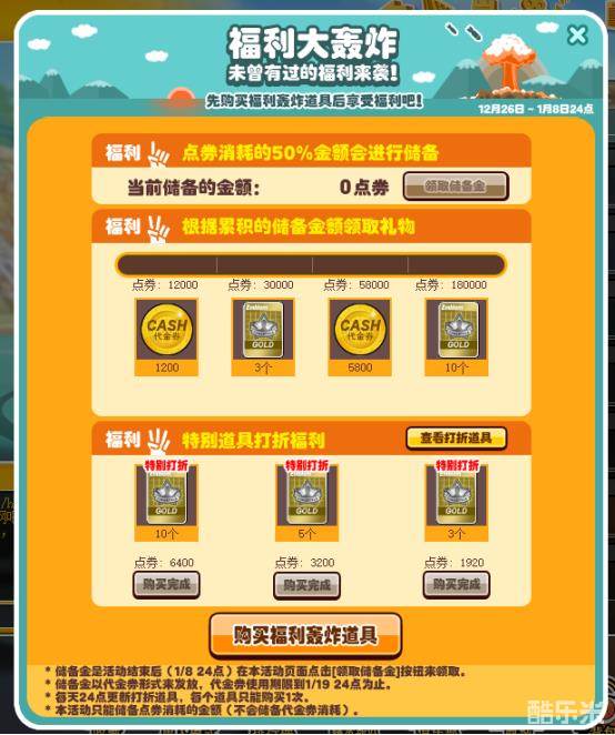 玩家参与活动需要购买道具“福利轰炸”道具(无法使用代金券购买),点券消耗的50%会进行储备,根据储备的金额进度可以领取礼物。购买道具“福利轰炸”后,每天可以购买特别打折道具。储备的金额会在活动结束后以代金券形式返利。代金券有效期至1月19日 24点。每天上午7点更新打折道具,每个打折道具限购买一次。本次活动只能储备点券金额,不储备代金券消费。