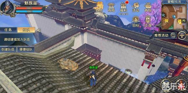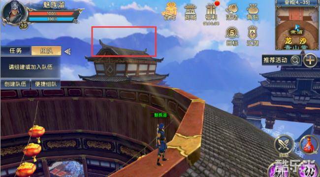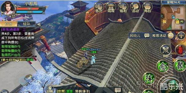 到青山堂第四层,在歌妓旁使用轻功飞起,踩到墙壁继续使用轻功,就可以到达围墙上面。在围墙上面可以看到有两座阁楼,有瓦片阁楼的坐标(56,4)跳到阁楼顶端就会发现瓦片。