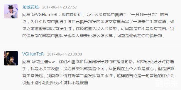 随后VG战队的CEO看到粉丝的回复之后,对于他们的盲目护韩援的话语要反驳了一番:韩国选手比赛出现问题了,他是韩援就说不得?什么叫好好对待韩援?中国选手不应该好好对待?