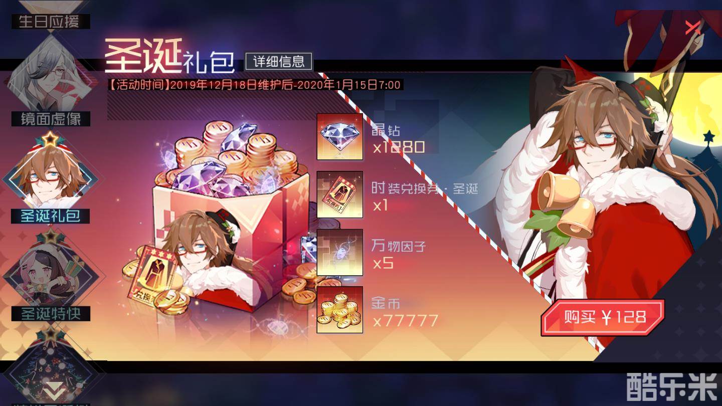 圣诞大礼包也限时上架商城,礼包内除晶钻、万物因子等物品外,还有道具“时装兑换券·圣诞”,购买后即可使用该道具从平安夜小叮当(赛斯)、协奏舞曲(幽桐)、森林公主(濑由衣)以及天界之白鸟(伽梨耶)时装中任意兑换一款。