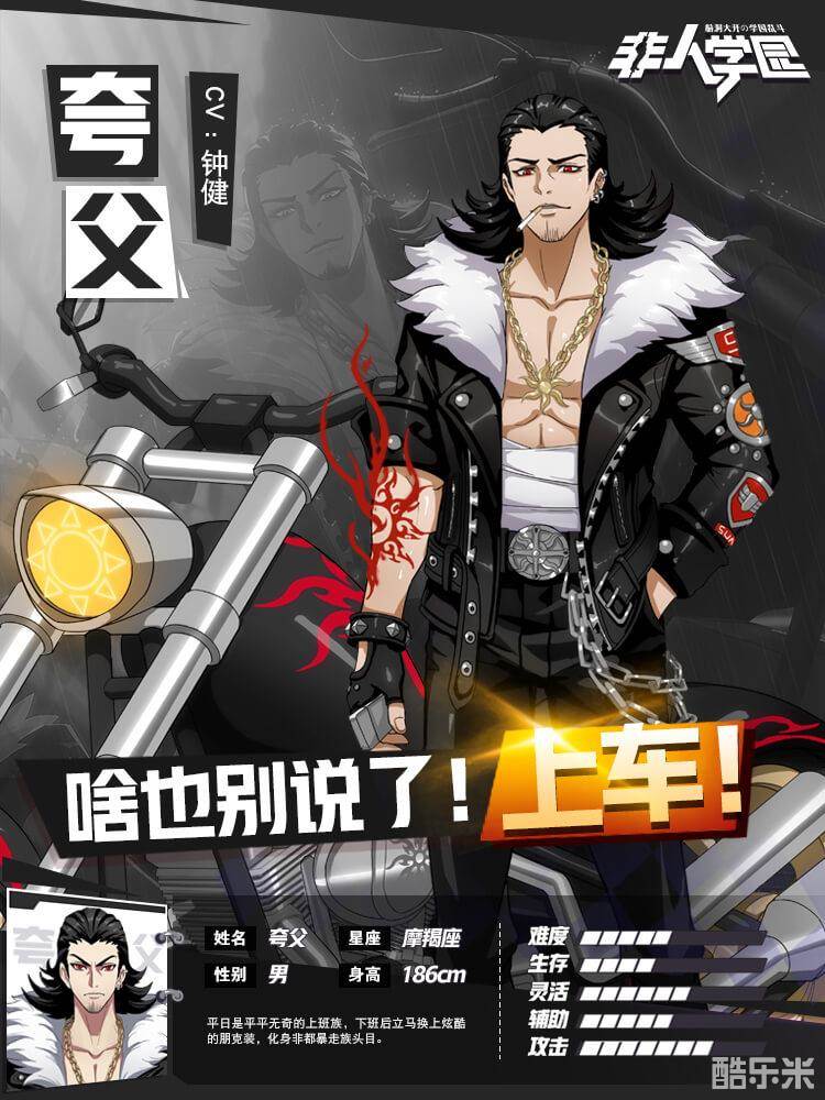 夸父,虽然看起来像凶猛的壮汉,但实际上仗义、热心,私下里很会照顾人。白天是平平无奇的上班族,长期的社畜让他极度厌烦枯燥的办公室生活。于是下班后,夸父会立马换上炫酷的朋克装,化身非都暴走族头目。