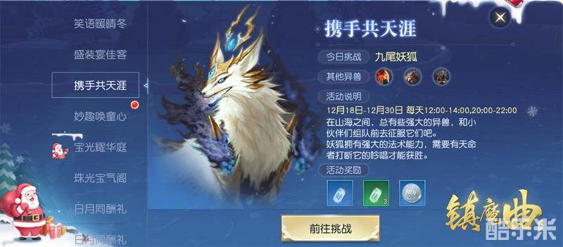 圣诞佳节万家同乐,却也有异兽想要为祸人间!法术强大效果莫测的妖狐,擅长控制敌人后收割的凤凰,还有能召唤众多小弟助战的三头犬……三只异兽趁机捣乱,天命者们怎能容忍?快快呼朋唤友携手进入秘境,战胜它们保人间安宁吧!成功击退后,还能收获它们所携的众多奇珍异宝,以作为天命者们守护人间的奖励!