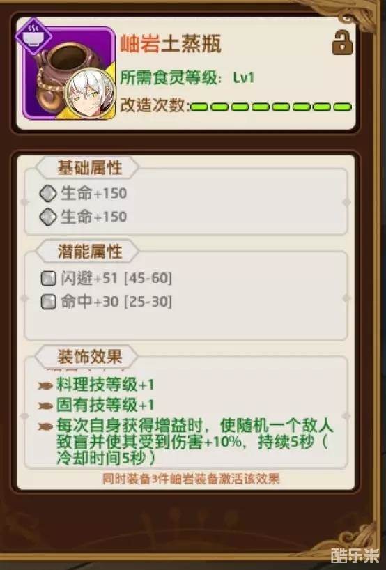 只与1个食灵相邻时:所有食灵,料理技的费用-1(最低至1)。重装料理技时,CD-25%(最低5秒)