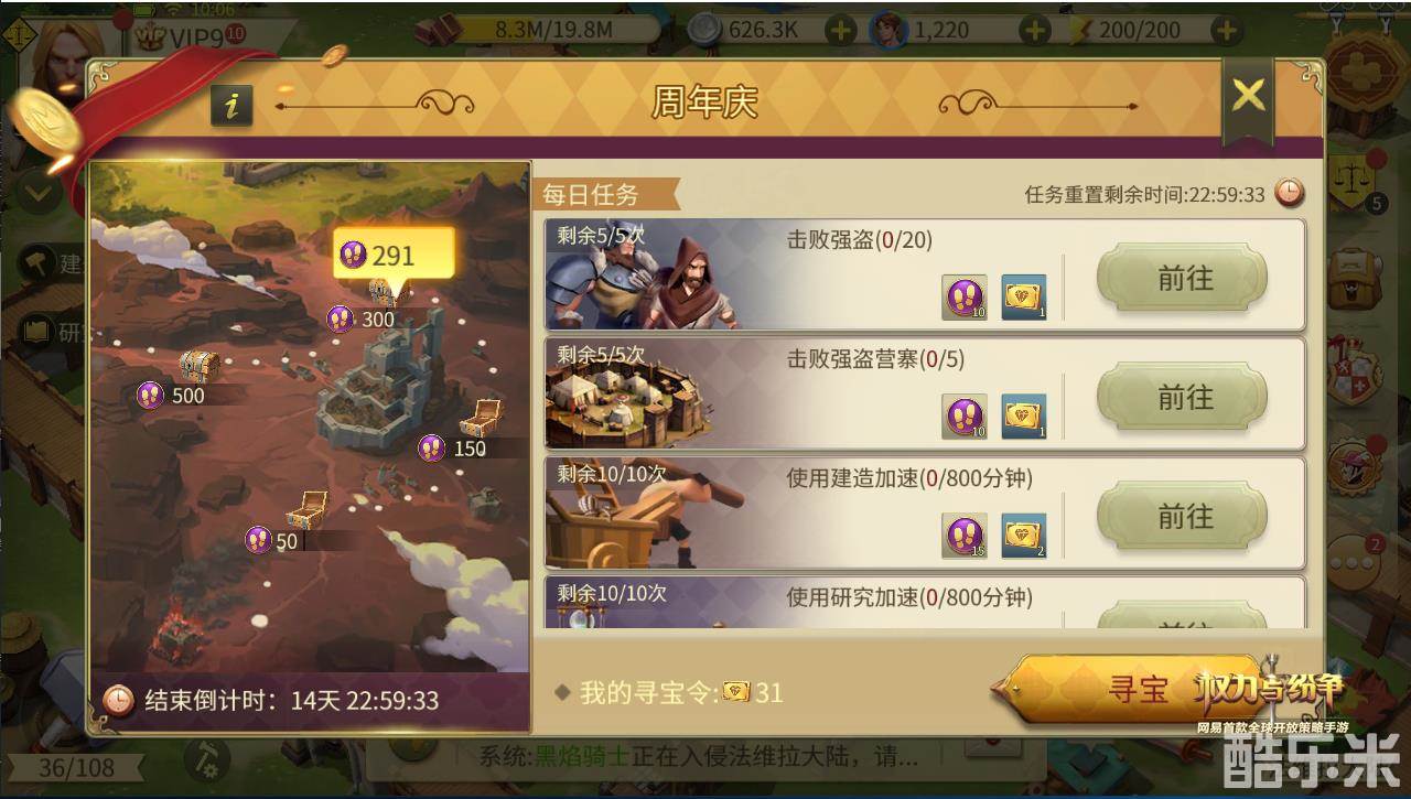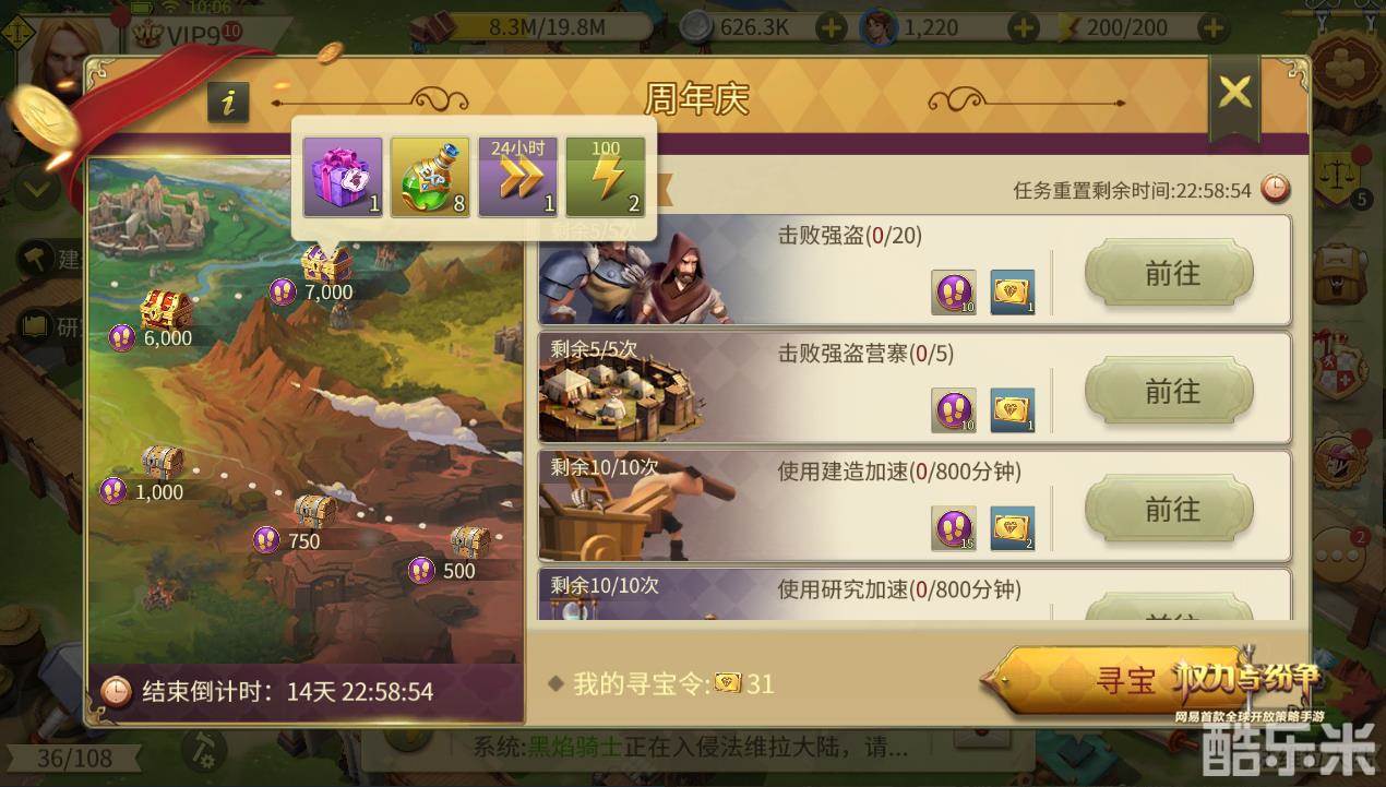 在活动期间,领主每天通过完成战胜强盗、强盗营寨,努力建设城市并使用建造和研究加速,与其他城市进行贸易、训练精锐士兵等每日任务均可以获得珍贵的寻宝令,同时也能积累活跃度。