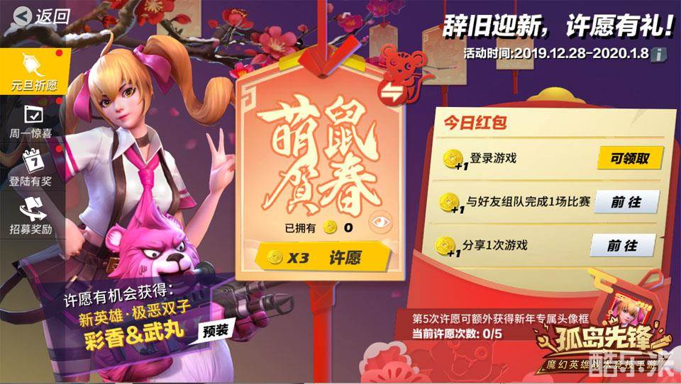 在2019年12月28日至2020年1月8日期间,玩家参与“元旦祈愿”活动,按要求完成指定任务即可获得许愿币奖励。每消耗三枚许愿币可进行一次许愿,将有机会获得秘宝钥匙、金钥匙、英雄成长资源、钻石等丰厚奖励。