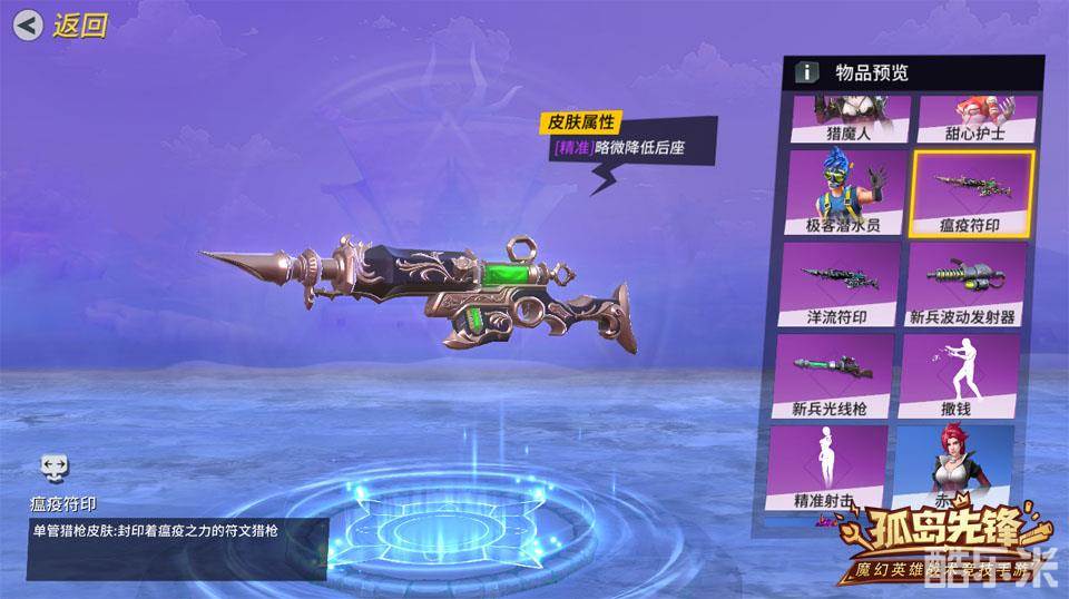 礼包中还包括单管猎枪史诗皮肤“洋流符印”和“瘟疫符印”以及其他多款皮肤奖励,为玩家开启《孤岛先锋》专属时尚惊喜。