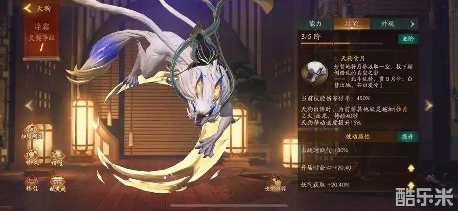 天狗出阵时,为前排其他妖灵施加蚀月之火效果,当前会心超过80点时,提升会心伤害结果与技能倍率,蚀月之火效果实时变化。