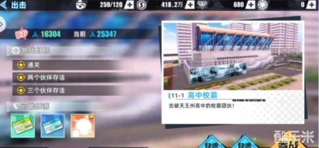 失落王冠手游主线副本11-1无双的主要任务是击破天王洲高中的校霸团伙。通关后可能掉落初级经验卡、中级经验卡以及粒子基因δ碎片,固定奖励为主角经验以及金币。