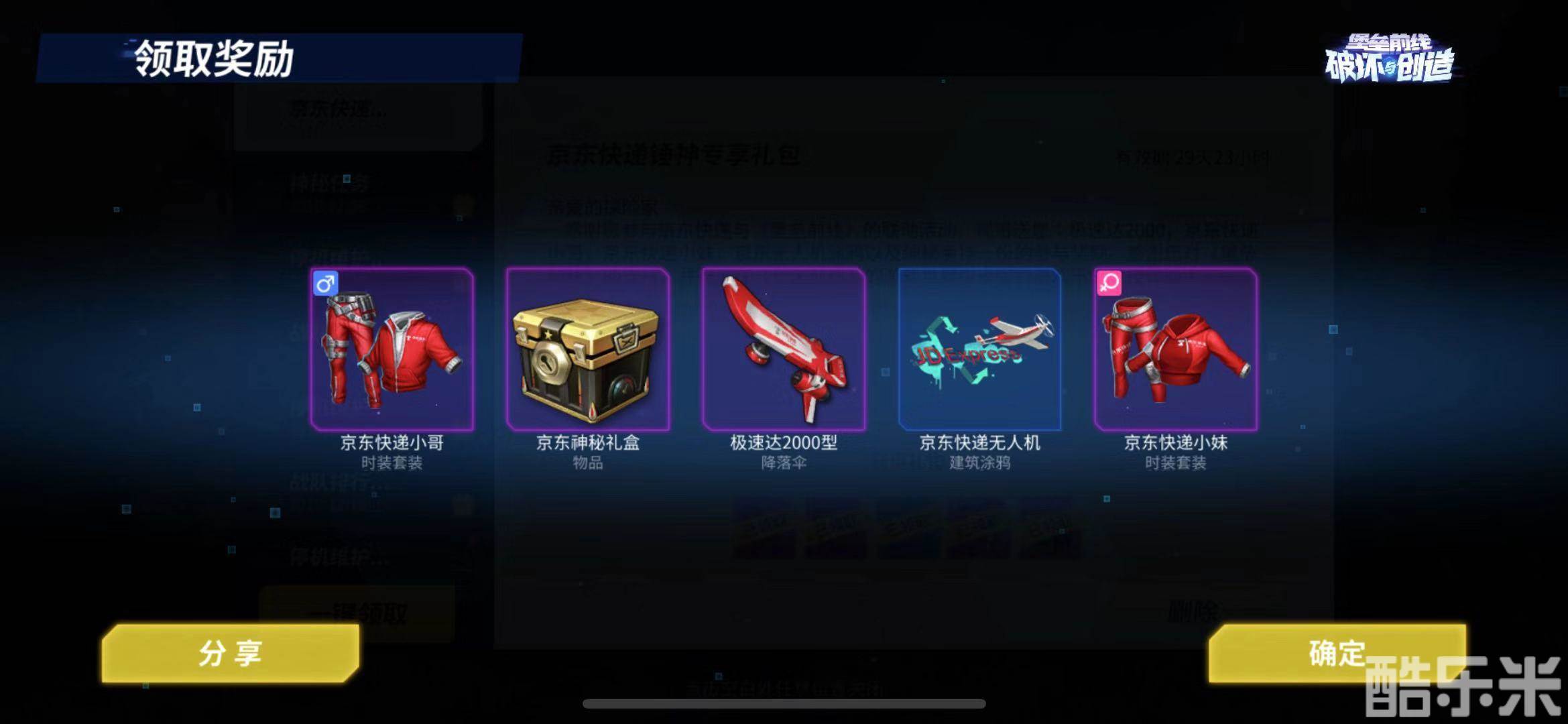 2019年12月26日-2020年1月9日联动活动期间,探险家可以通过以下方式进入礼包领取页面,领取页面进入方法包括:京东商城app内推送;在京东小哥微信公众号“堡垒前线”菜单栏,输入关键字“堡垒前线”;扫描堡垒前线大锤定制版京东快递箱;扫描新年定制版自提柜上二维码。完成账号验证操作即可获得“京东快递锤神专享礼包”,礼包将通过游戏内系统邮件发放。