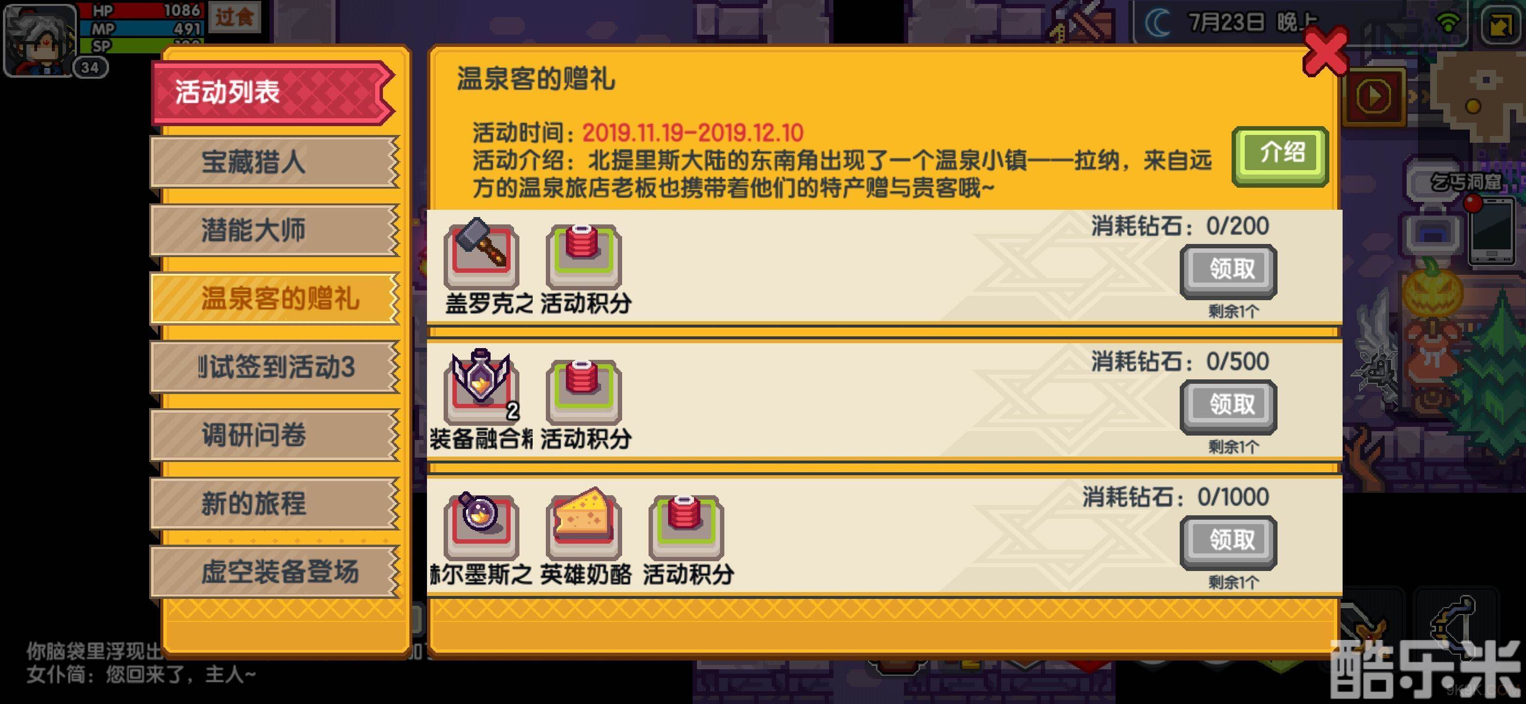 温泉客的赠礼完成方法非常的简单,累计消耗钻石,就能够获得相应的奖励,共分为6档,分别对应消耗10钻石,50钻石,100钻石,200钻石,500钻石和1000钻石,消耗100钻石能够获得3个虚空尘埃,而消耗500钻石和1000钻石分别能获得装备融合精华和赫尔墨斯之血哦,最后要注意每完成一档,就能够获得1点活动积分,活动积分能够在“新的旅程”活动中兑换物品。