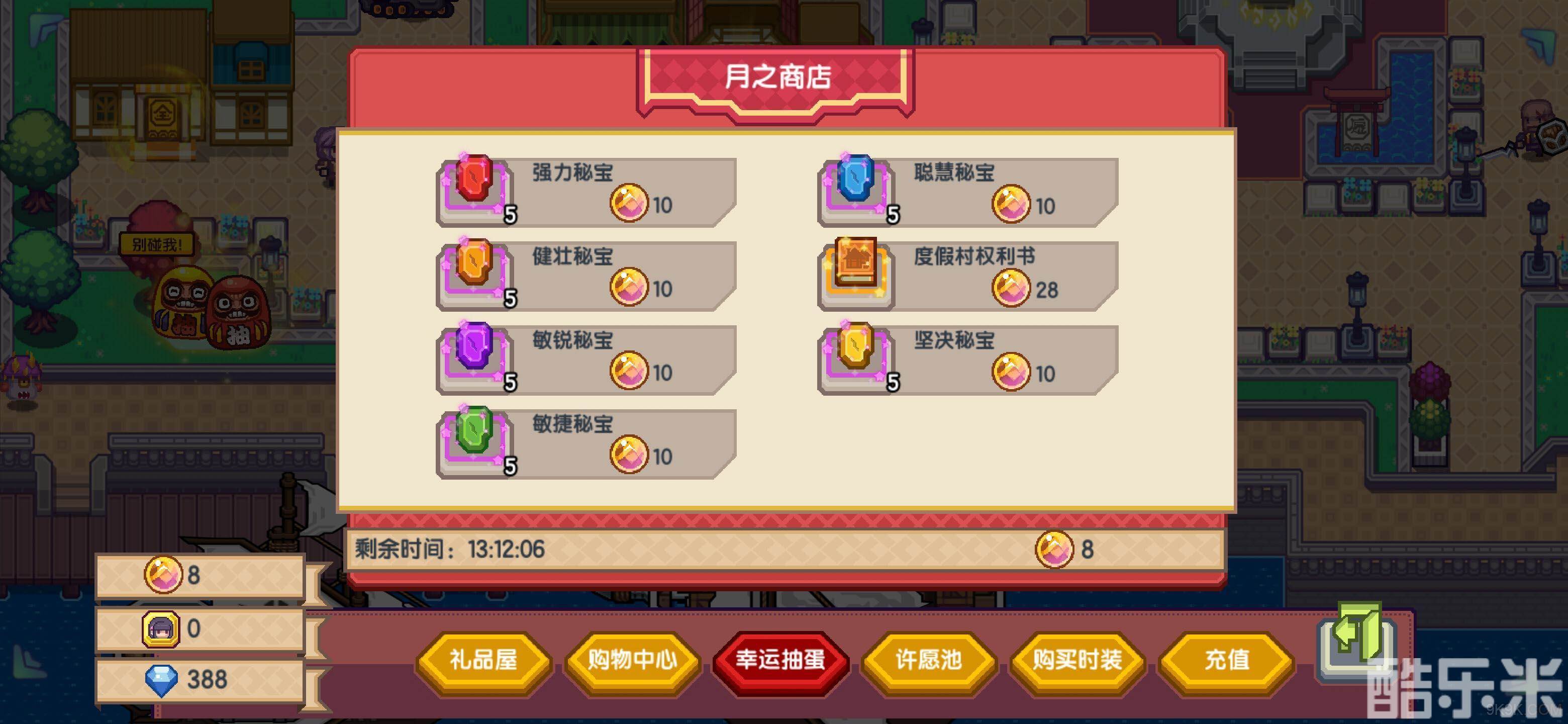 本次依旧推荐在商城中购买礼包来消耗钻石,除此之外,在幸运扭蛋中抽蛋也是很不错的选择,冒险者们可以通过抽蛋来获得星之碎片,随后便能够凭借星之碎片去月之商店中兑换各种秘宝和度假村权利书啦,要注意这些物品都非常稀有哦,尤其是度假村权利书。