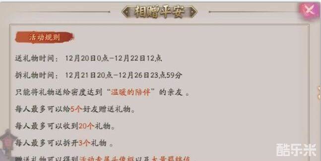 再来说说送礼物的事情,请注意,一人可以收到20个礼物,可以给5个好友送礼物,但是!每个人只能拆开3个礼物,领了多的也拆不了,只能退还给对方。