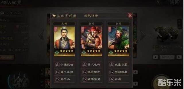 此时只要屯好资源升8级主城,然后升级3级帅令坛,将统率提升至20,桃园队即可成型了。桃园队对于S2来说,还是属于T1队伍,由于刘备张飞的存在,其稳定性高,爆发就看关羽的战法释放情况。总体来说,还算是比较厉害的队伍,队伍过渡也比较平稳。