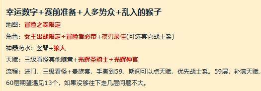 流程:进门,三级看怪+贵族套,手撕到59,期间可以点天赋,优先战士系。59层,补满天赋,加生命的先点最后点光辉圣骑士,给猴子道具。下到boss层,吃狼人,磨血,损失血量>1208后,一口神恩,打死boss。冒险者遇见村民的概率是24%,60层期望遇见13个,如果没够往下走几层问题不大。