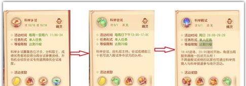 考试内容:可从限时任务里面选择科举乡试前往NPC处答题,一共十题,答对6道过关;可以选择天文地理和人文历史两个方向的试题。