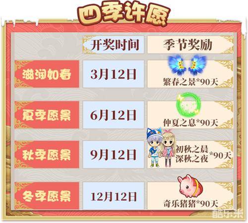 在2020年1月1日 - 2020年12月11日期间,选择任意季节的礼物并投入100金币就能进行许愿!之后每个季节都会随机抽取许愿该礼物的10名玩家送出对应奖励: