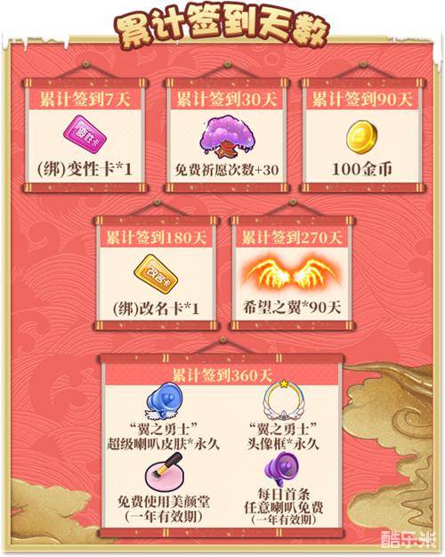 当您许下任意一次愿望之后,即可在2020年1月1日到2020年12月31日期间,根据您累积签到的天数给予你奖励,补签可计。