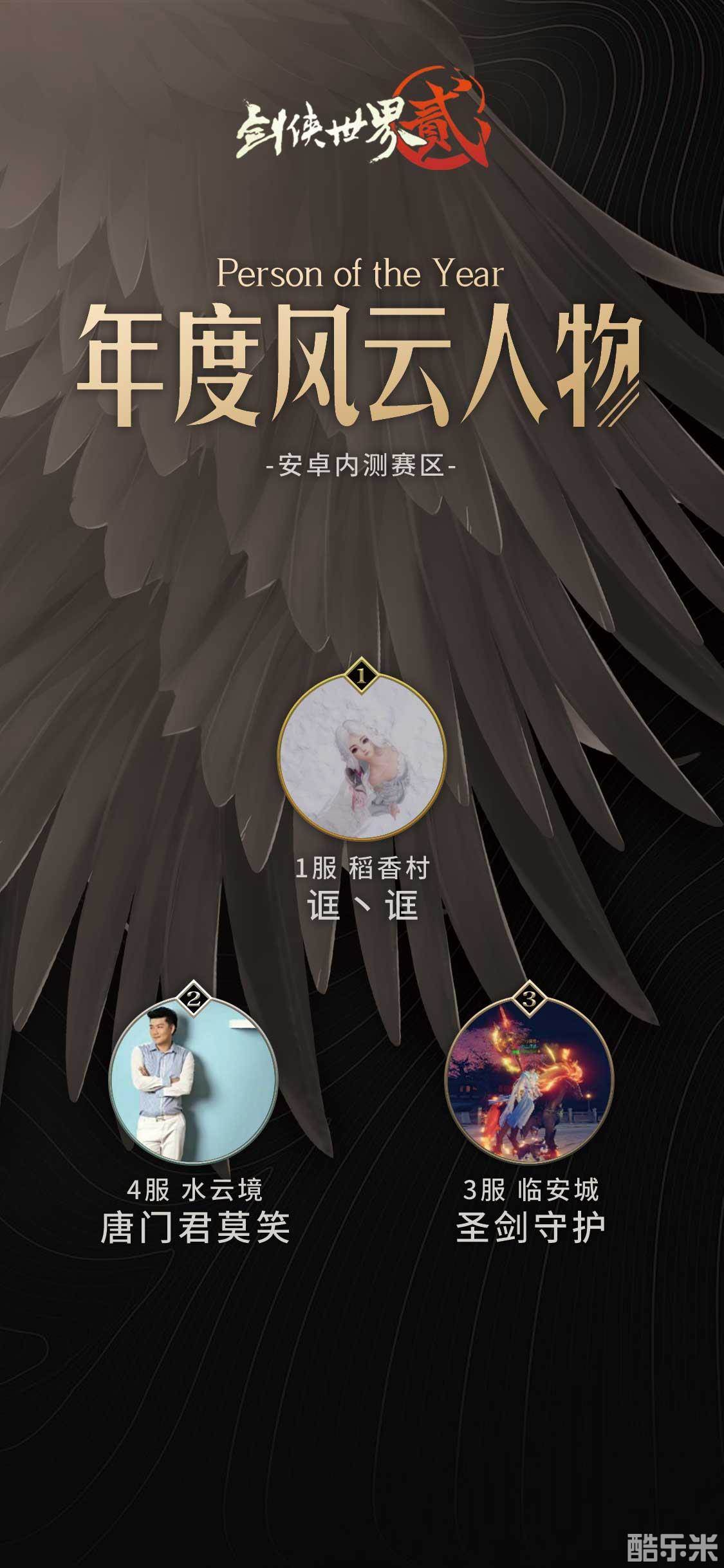 获得「安卓内测赛区」年度风云人物的玩家有:来自稻香村服务器的“诓丶诓”,来自水云境服务器的“唐门君莫笑”以及来自临安城服务器的“圣剑守护”,恭喜以上少侠!
