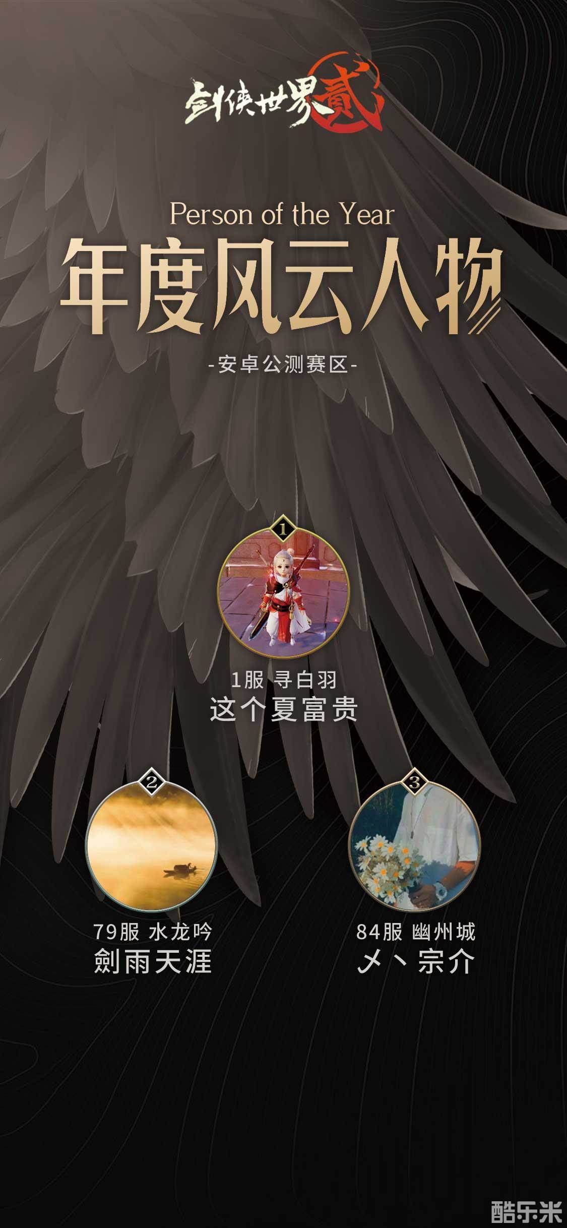 获得「安卓公测赛区」年度风云人物的玩家有:来自寻白羽服务器的“这个夏富贵”,来自水龙吟服务器的“劍雨天涯”以及来自幽州城服务器的“乄丶宗介”,恭喜以上少侠!