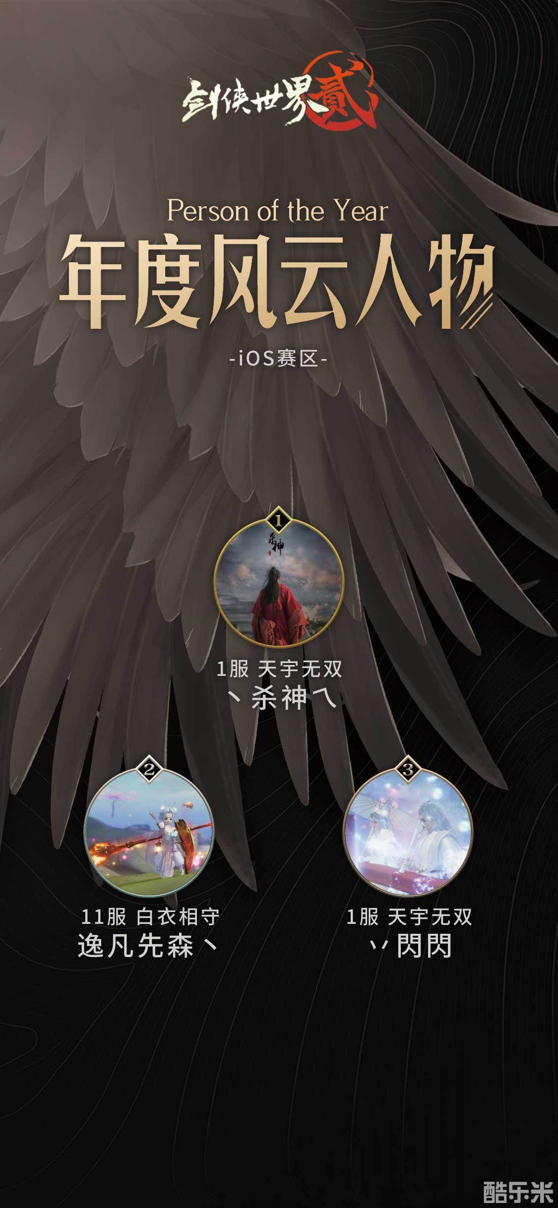 获得「iOS赛区」年度风云人物的玩家有:来自天宇无双服务器的“丶杀神乀”,来自白衣相守服务器的“逸凡先森丶”以及来自天宇无双服务器的“丷閃閃”,恭喜以上少侠!