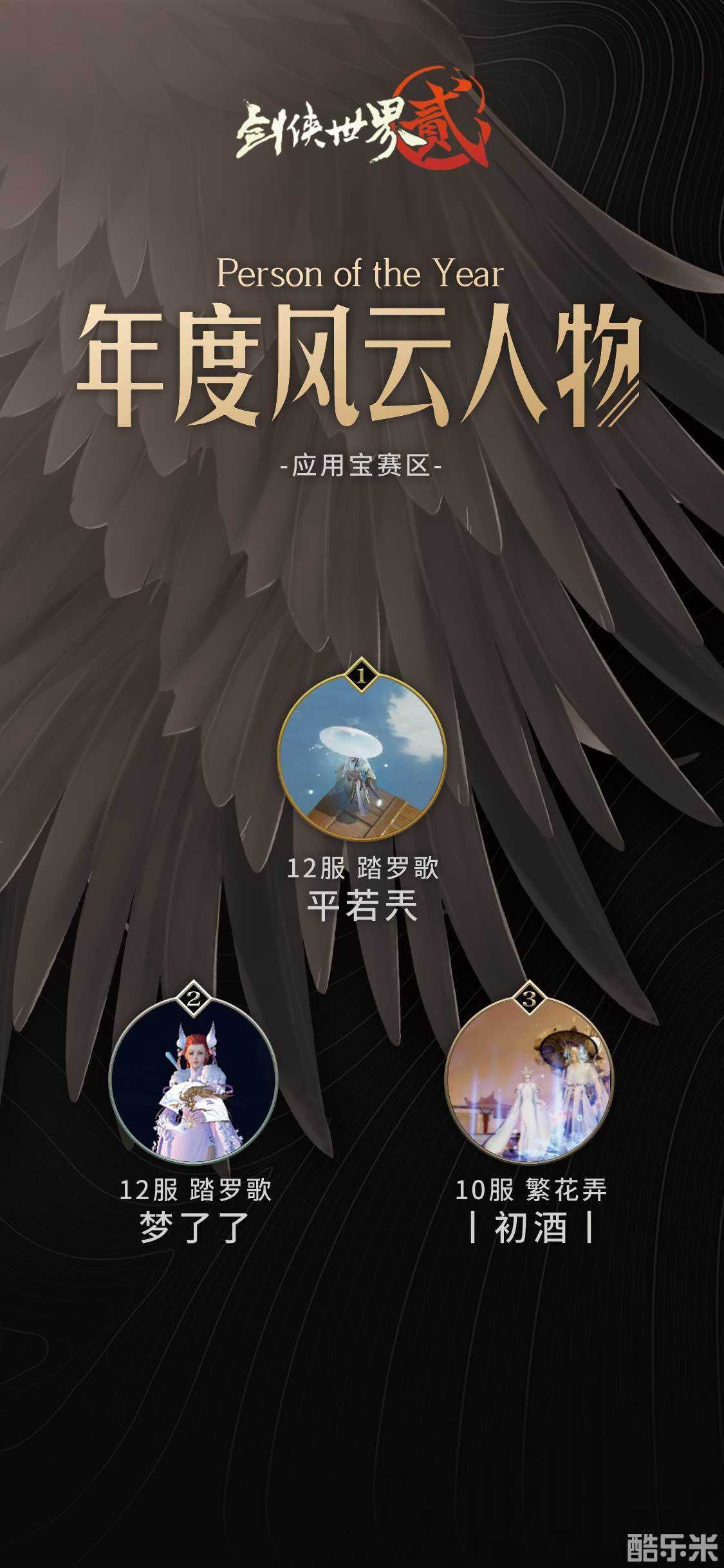 获得「应用宝赛区」年度风云人物的玩家有:来自踏罗歌服务器的“平若兲”,来自踏罗歌服务器的“梦了了”以及来自繁花弄服务器的“丨初酒丨”,恭喜以上少侠!