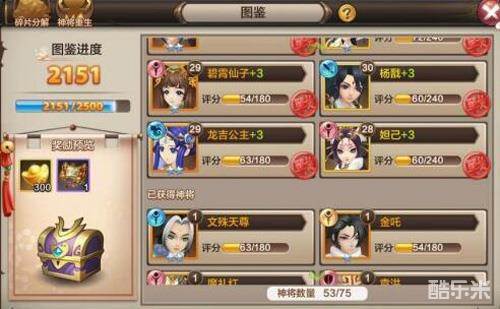 ②满足一定的神将图鉴评分总和就可以获得元宝和御神符的奖励。只要获得新的神将,就可以加分,而且所有的神将升星都可以增加评分。但是神将升星有上限,达到上限了,就可以把多余的神将碎片分解成仙魄,给主阵容神将升级当材料了。