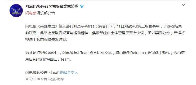 昨天傍晚,闪电狼俱乐部官方发公告宣布队内打野选手Karsa被禁赛。