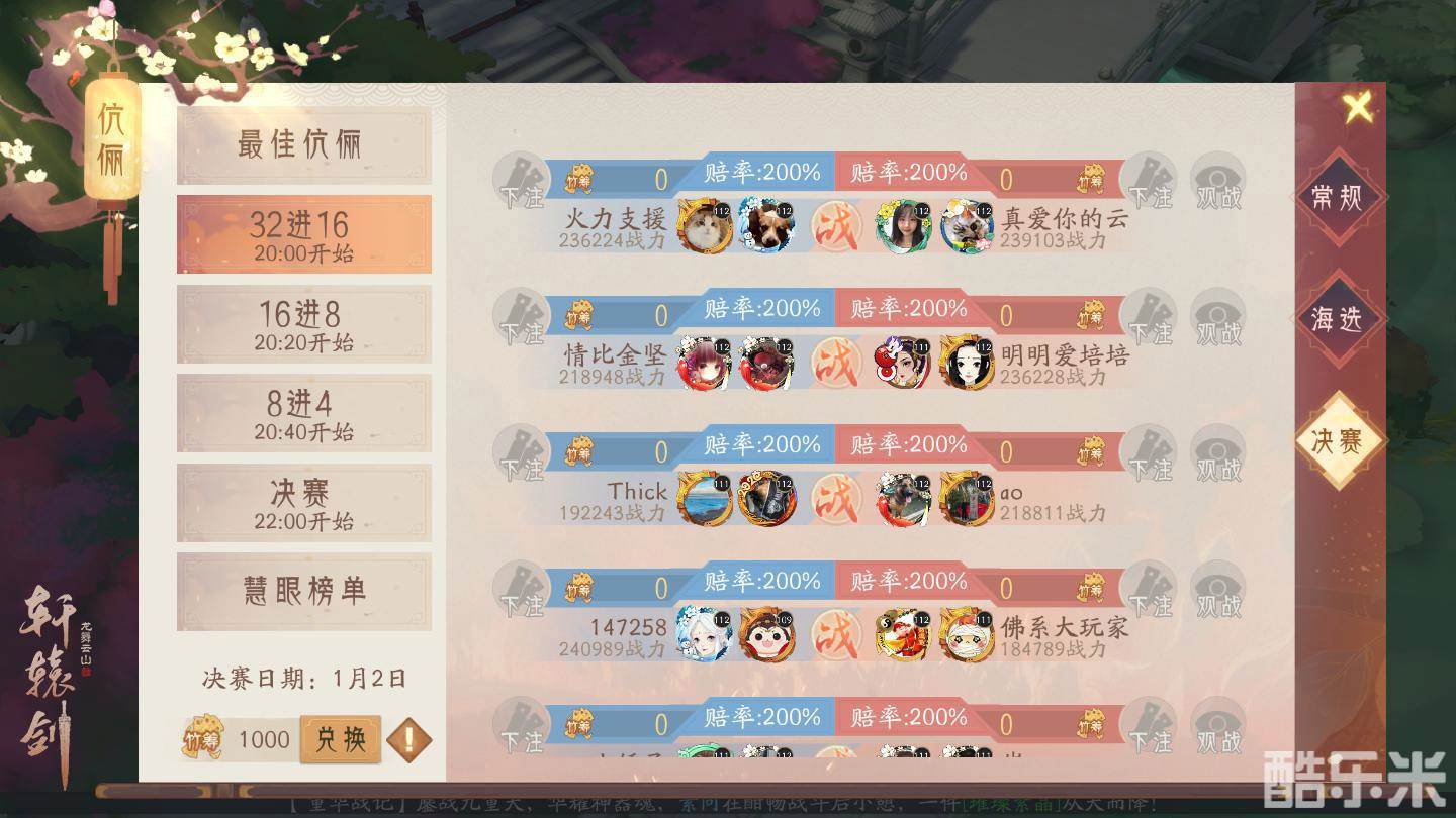 喜迎新年,《轩辕剑龙舞云山》特开启多重福利活动,其中备受瞩目的活动之一,便是疆场伉俪比赛。经过海选赛的激烈角逐,现已有32组少侠脱颖而出,将于今晚(1月2日)参与淘汰赛。最终冠军花落谁家,令人无限期待。