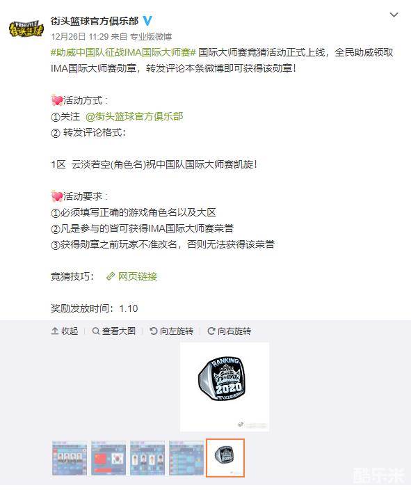1.4-1.5比赛期间,发布微博@ 街头篮球官方俱乐部 或者贴吧发布IMA国际大师赛相关帖子并截图私信官博君将可以获得国际大师赛荣誉(4选1)!