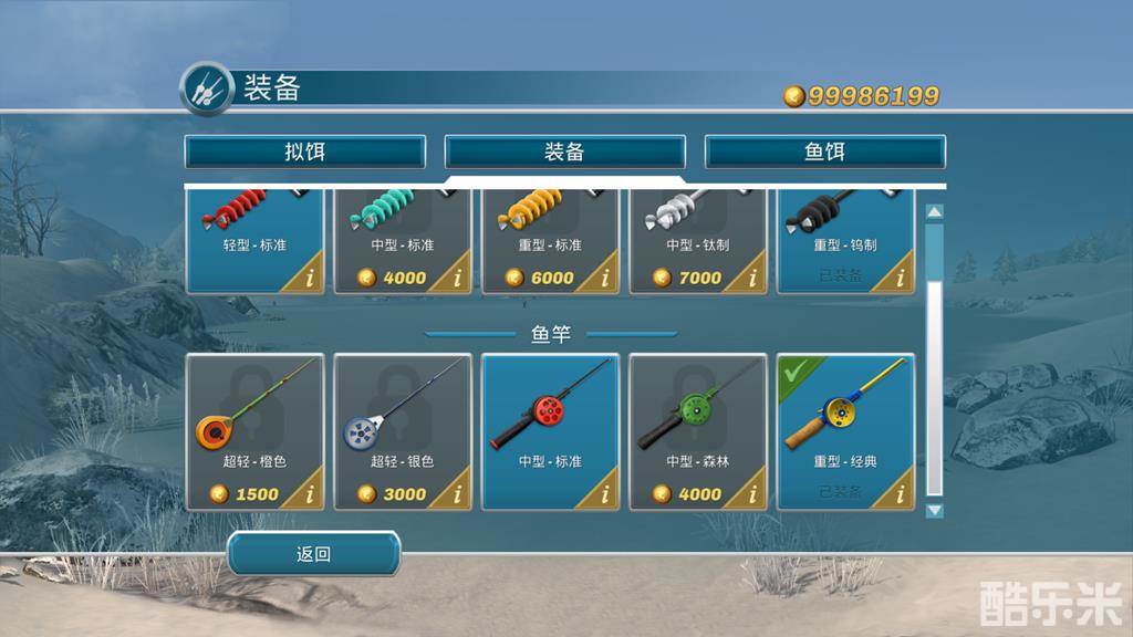 游戏的装备分为拟饵、鱼饵、鱼竿、钻头、诱饵,其中有多种不同类型可选。针对不同的垂钓环境玩家可以选择更适合的垂钓装备。玩家选择不同的冰钓装备便可以钓上不同品种的鱼类,怎样搭配适合自己的钓鱼装备,需要玩家自己去摸索与尝试。