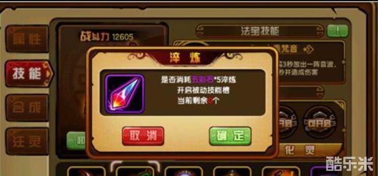 每次开启一个法宝被动技能槽需要消耗5个五彩石