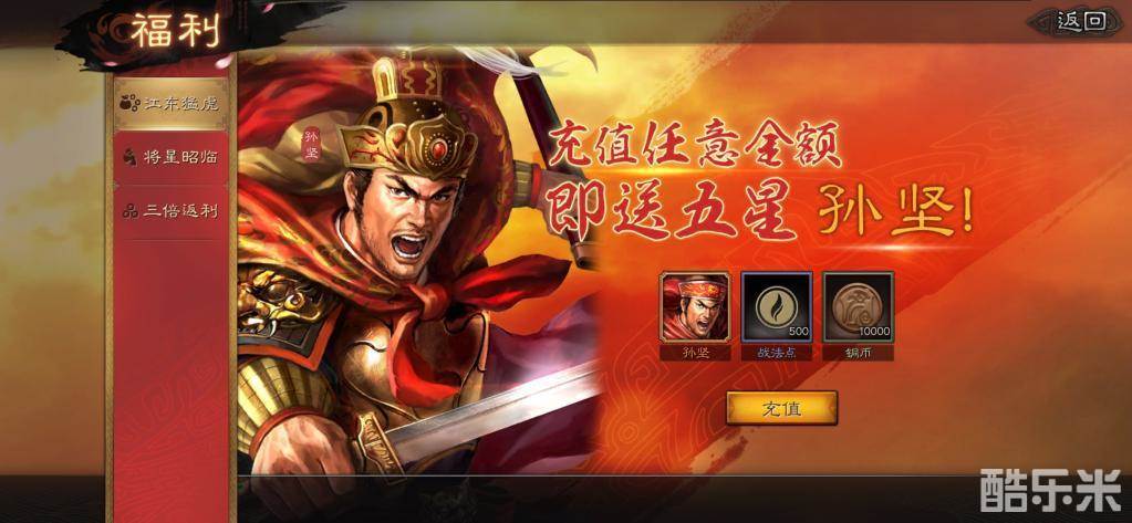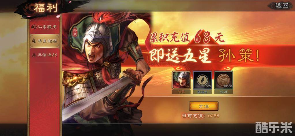 1、开荒武将是可以选择首冲赠送的孙策孙坚,68元并不亏。