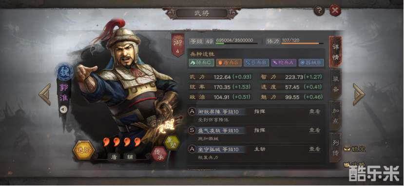 满红全智力加点的郭淮,智力属性也就略微低于一般的五星智将,佩戴治疗战法时也有不逊色于刘备的治疗能力,最为廉价的成本、最高的效益,双抗高,兵种适应性也强。