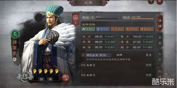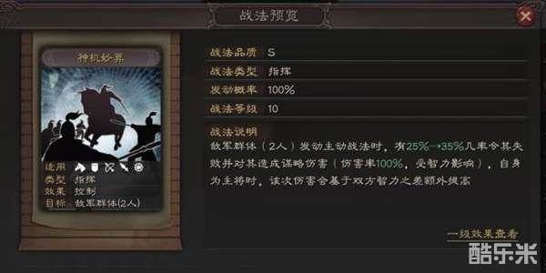 诸葛1战法神机妙算,在开场时对敌方任意2人应用,就在2人应用主动战法时,有35%概率使其失效并给与伤害,主导将时更能够按智力差给与额外伤害。S1环境下,盛气凌敌异彩纷呈,菜刀队无处话凄凉。前有刘关张一夫当关,后有吴国大都督火烧连营,这时诸葛见机行事,带著后期高智力、高统率的面版,在賽季后半期异彩纷呈。早期因为诸葛无平稳输出手段,早期陣容仍未平稳的情况下,诸葛并不得青睐,而后期随着陣容逐渐成型,诸葛在后期成了输出能力高,有反制手段的强力将领。并且1战法根据双方智力差值外提升,对低智力将领来讲,1战法的输出十分可怕。